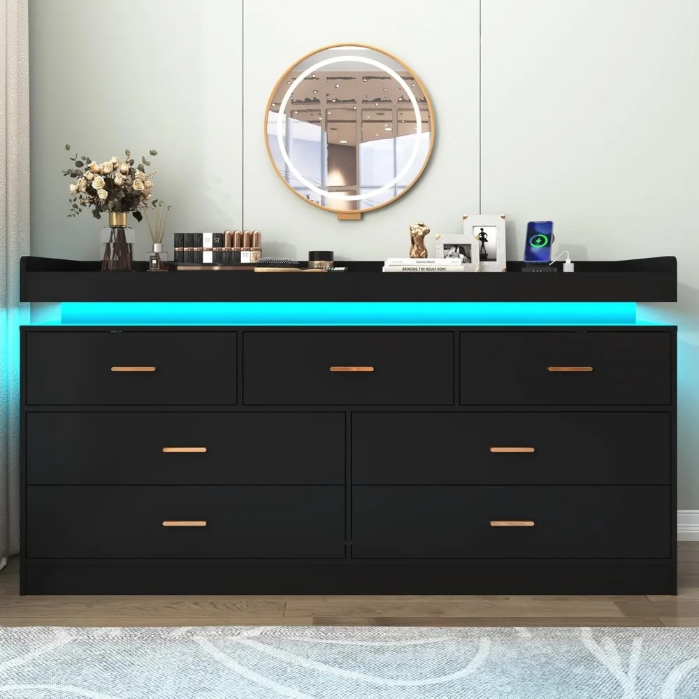 7 Drawer Dresser with LED Light and Charging Station, Modern Chest of Drawers for Closet, Wide Drawer Organizer Cabinet for Bedr