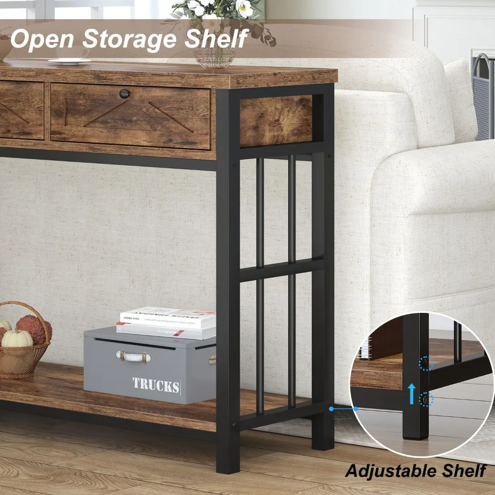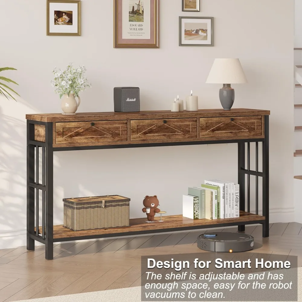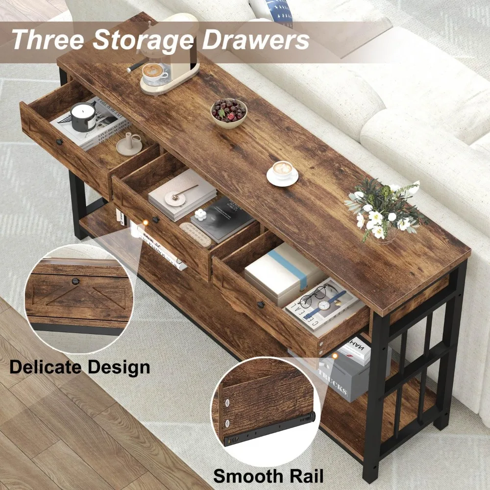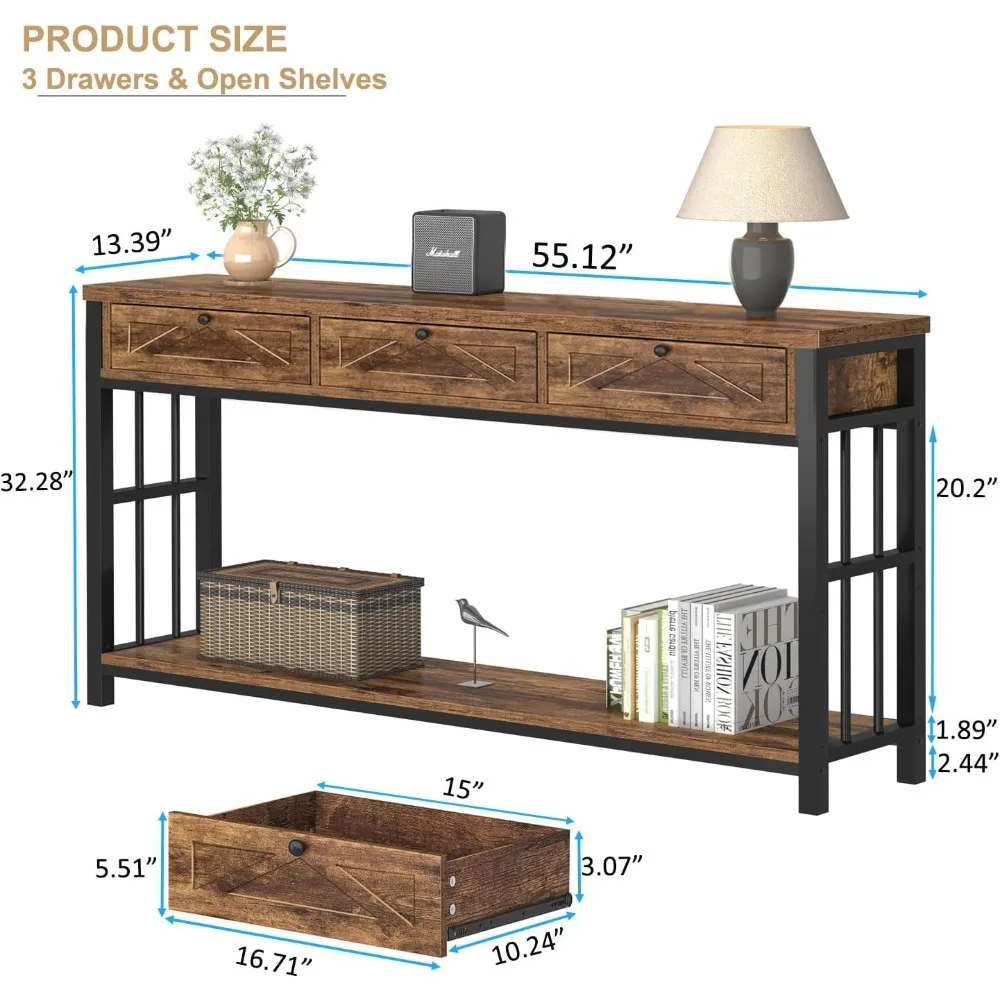 - 【Ample storage with Drawers & Shelves】 This 55-inch brown sofa table with storage offers 3 drawers and one open shelf, providing abundant storage to keep your space neat. Use the tabletop for lamps, vases, or decor while displaying books and photos on the open shelf. The hidden drawers ensure a clutter-free surface, making brown console table with drawers ideal for entryways, living rooms, or behind sofas, adding a rustic touch to your home