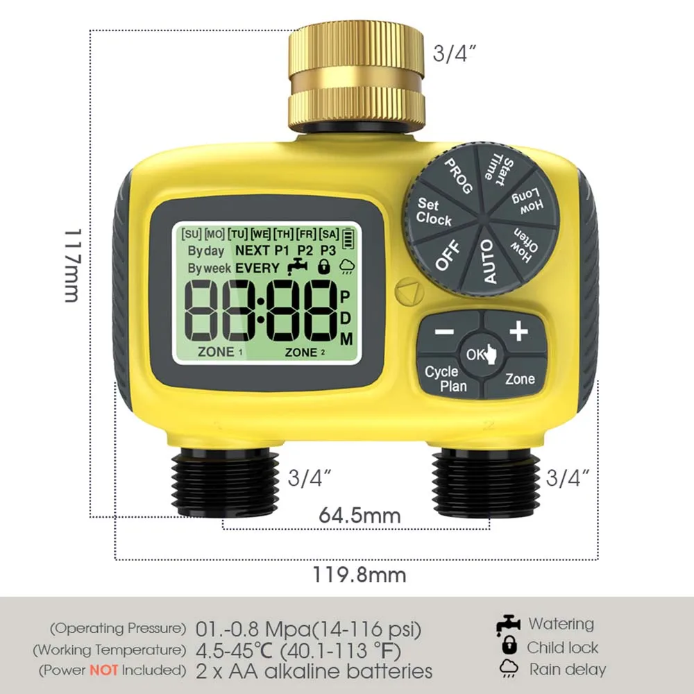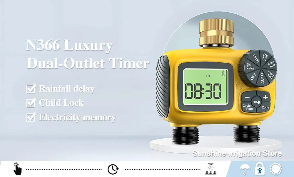 ✿ The N366 Luxury Dual-Outlet Timer features 1-3 customizable watering plans per zone, with durations from 1 minute to 23 hours 59 minutes. It includes a 1-15 day rain delay, manual mode (1-120 min), child lock, low battery protection, and power-off memory, ensuring efficient and reliable irrigation for gardens, lawns, and outdoor plants